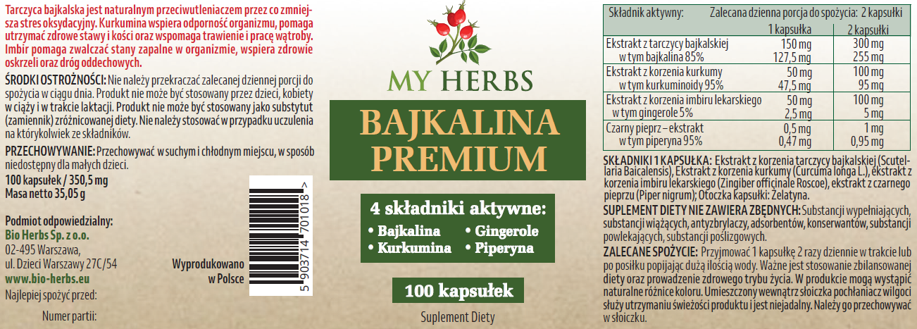 Ekstrakt z korzenia tarczycy bajkalskiej (Scutellaria Baicalensis), Ekstrakt z korzenia kurkumy (Curcuma longa L.), ekstrakt z korzenia imbiru lekarskiego (Zingiber officinale Roscoe), ekstrakt z czarnego pieprzu (Piper nigrum); Otoczka kapsułki: Żelatyna.
