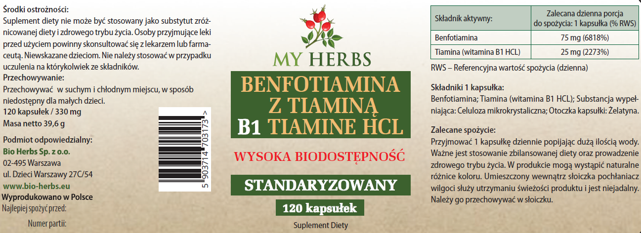 BENFOTIAMINA Z TIAMINĄ B1 TIAMINE HCL STANDAR 120 KAPS