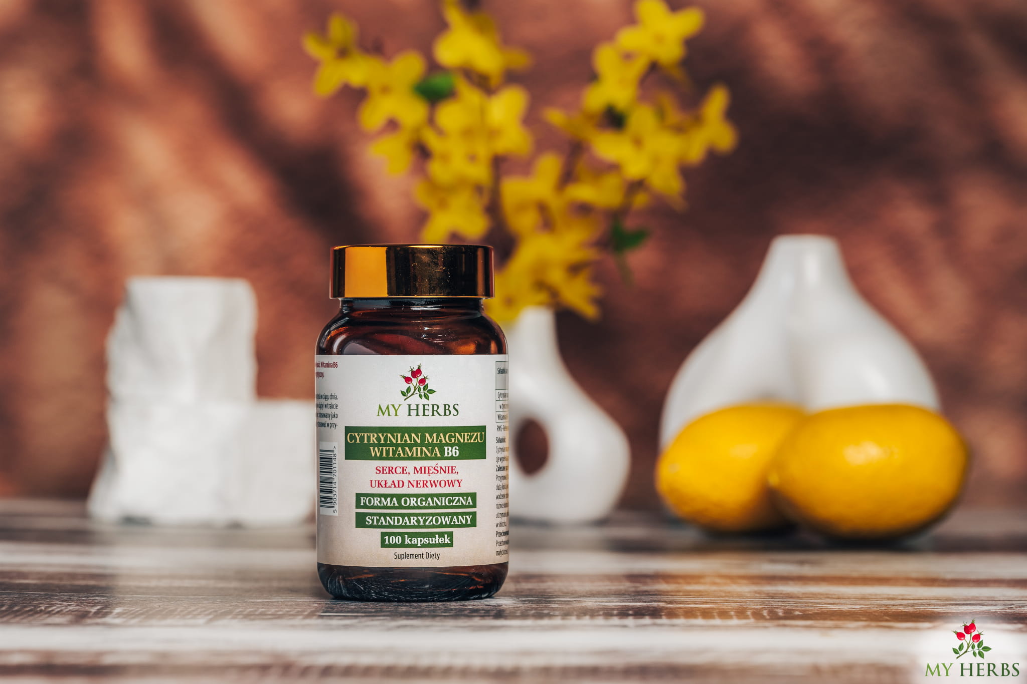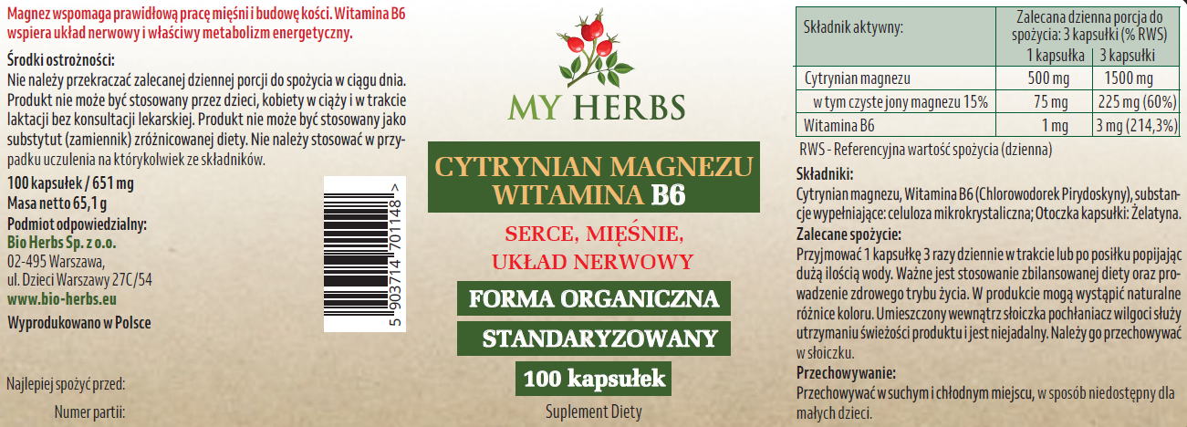 Cytrynian Magnezu + Witamina B6 to suplement diety składający się z cytrynianu magnezu i witaminy B6. Cytrynian magnezu to organiczna forma występowania magnezu jest to jedna z najlepiej jak nie najlepiej przyswajana forma magnezu. Wykazuje on bardzo dobrą rozpuszczalność i stabilność, dlatego jest jednym z najczęściej rekomendowanych preparatów magnezowych dzięki czemu magnez trafia do naszego organizmu, a nie jest wydalany. Dodatkowo w naszym suplemencie znajdziecie również witaminę B6, która oprócz swojego działania zwiększa również przyswajalność magnezu nawet o 40% oraz umożliwia właściwy transport mikroelementów do tkanek organizmu przez co umożliwia utrzymanie właściwego stężenia magnezu. Oba składniki czyli magnez i witamina B6 są niezbędne dla prawidłowego funkcjonowania organizmu człowieka i biorą udział w większości procesów biochemicznych. Na obniżenie zawartości tych składników w organizmie narażone są szczególnie osoby o wzmożonej aktywności fizycznej.