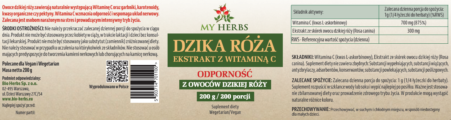Dzika róża, a w szczególności jej owoce są niezwykle cenne ze względu na naturalnie występującą w nich Witaminę C oraz bioflawonoidy. Ekstrakt z owoców dzikiej róży pozwala zachować naturalne prozdrowotne działanie owoców dzikiej róży. Występująca w niej Witamina C jest pochodzenia naturalnego i dlatego jest dobrze tolerowana i przyswajana przez organizm ludzki, co pozwala podnieść wchłanialność kwasu L-askorbinowego.