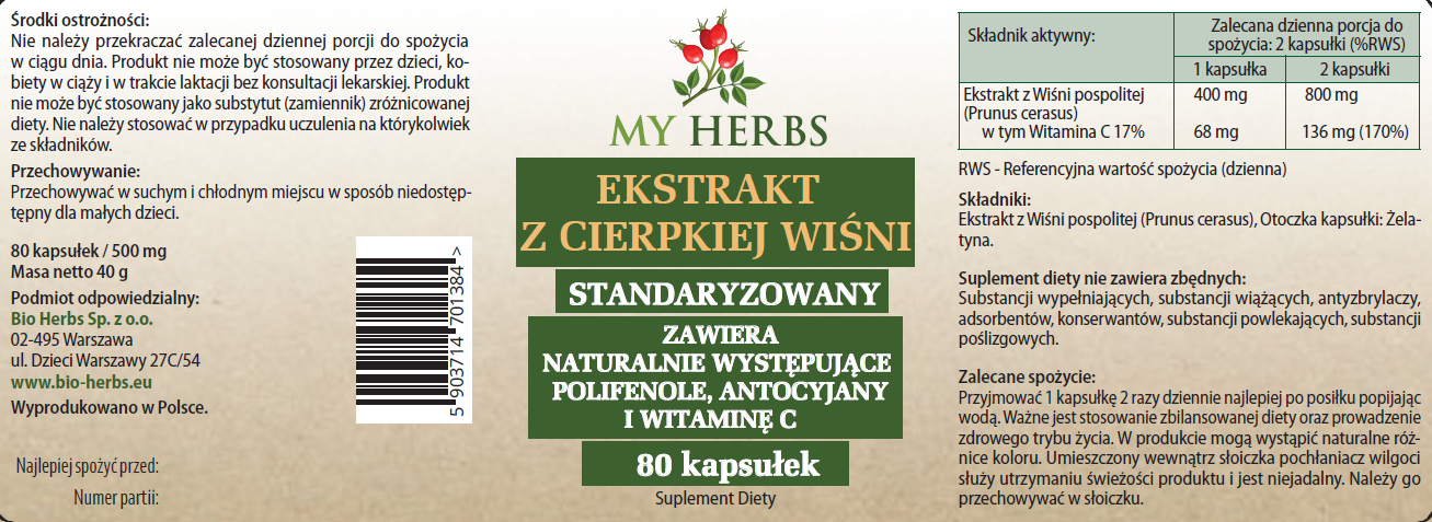 Ekstrakt z Cierpkiej Wiśni 80 kapsułek Polifenole, Antocyjany, Witamina C