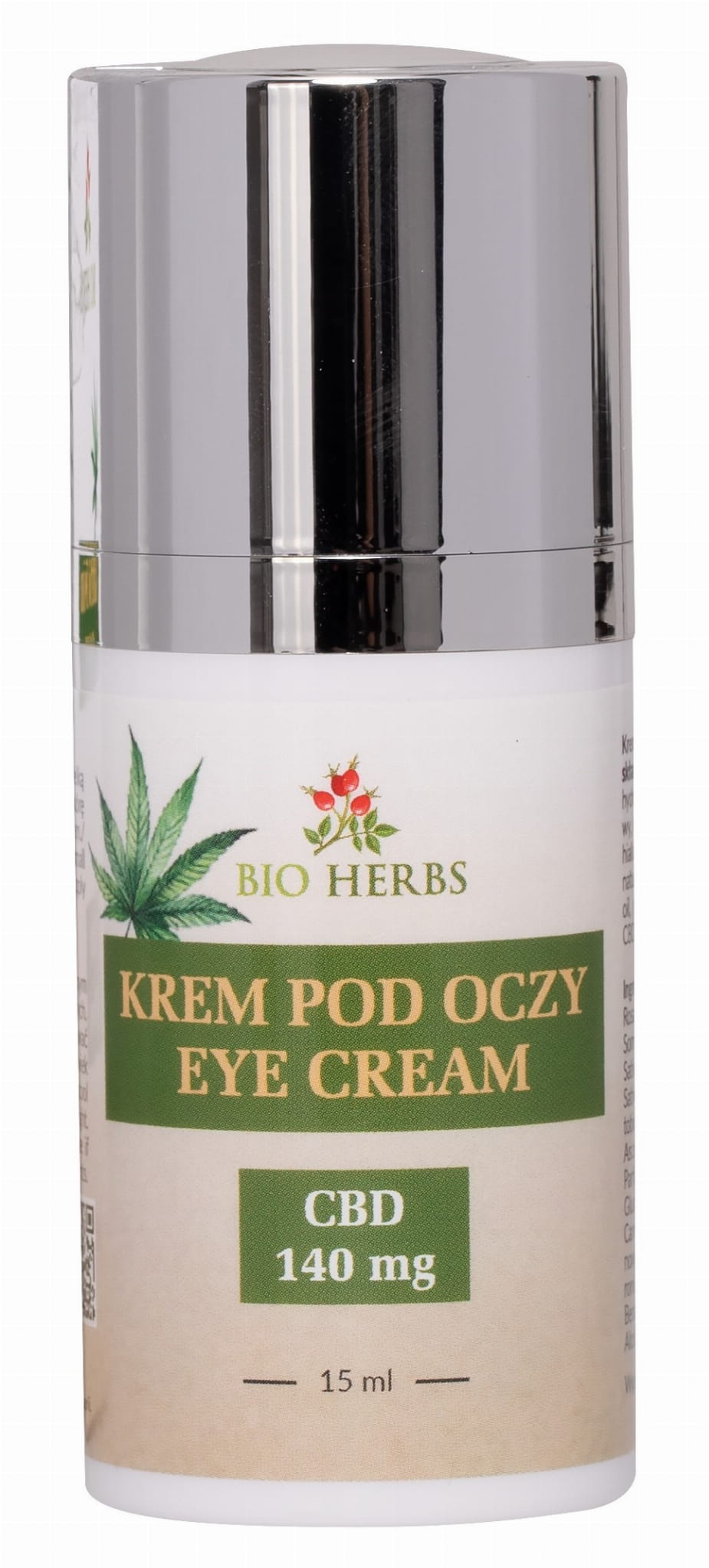Krem pod oczy zawiera naturalne składniki: hydrolat z róży, olej konopny, olej makowy, ekstrakt z liści konopi, CBD i kwas hialuronowy.