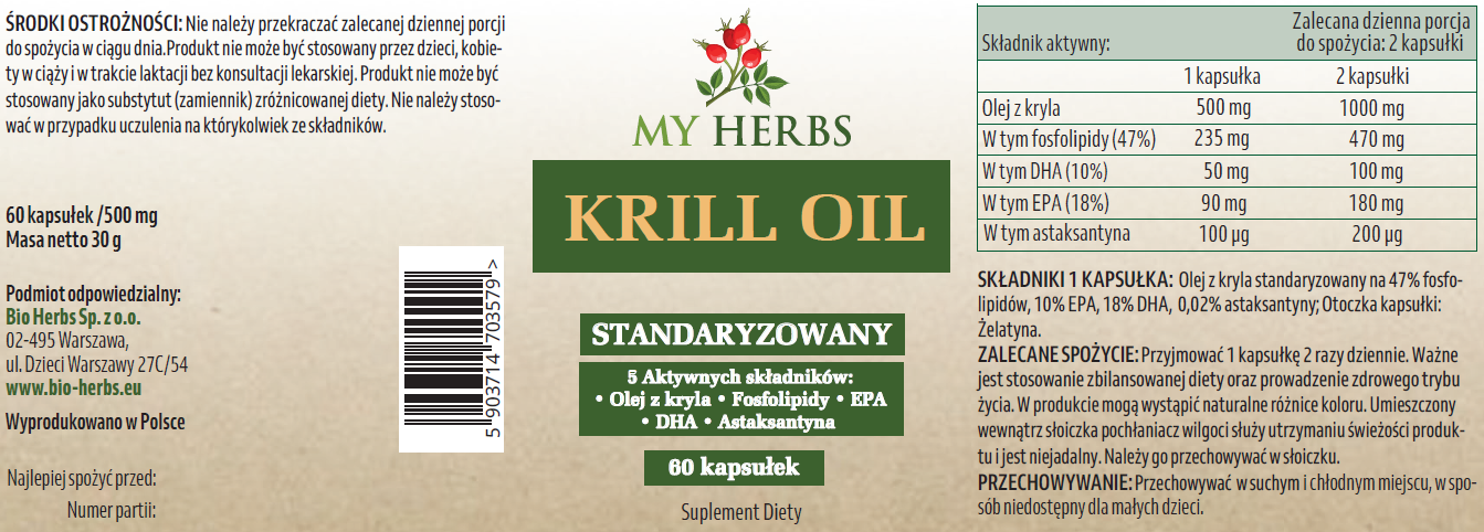 Olej z kryla standaryzowany na 47% fosfolipidów, 10% EPA, 18% DHA, 0,02% astaksantyny; Otoczka kapsułki: Żelatyna.