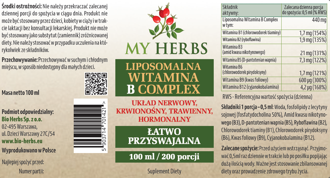 LIPOSOMALNA WIT. B COMPLEX B1 B2 B3 B5 B6 B9 B12 100ml DOSKONAŁE WCHŁANIANIE