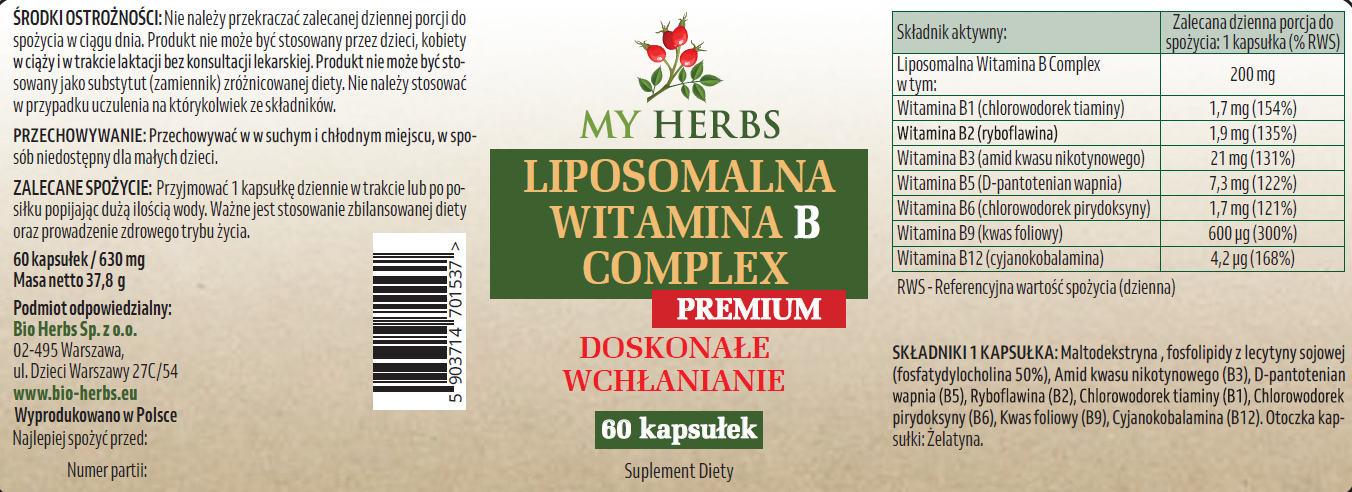 LIPOSOMALNA WITAMINA B COMPLEX B1 B2 B3 B5 B6 B9 KWAS FOLIOWY B12 60szt DOSKONAŁE WCHŁANIANIE