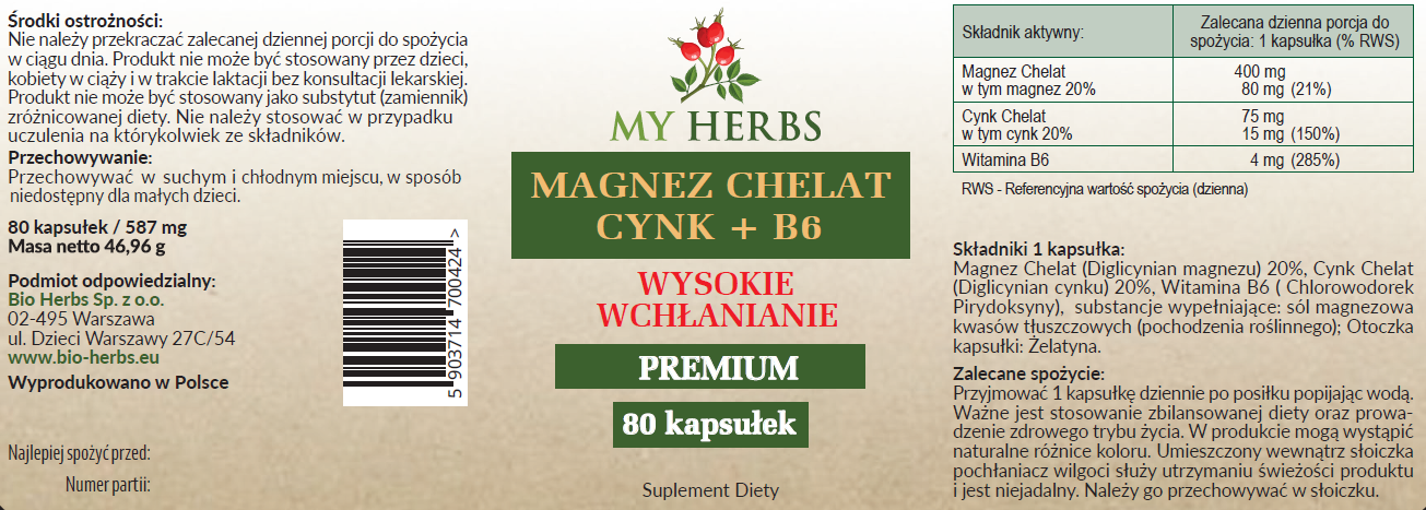 Magnez Chelat (Diglicynian magnezu) 20%, Cynk Chelat (Diglicynian cynku) 20%, Witamina B6 ( Chlorowodorek Pirydoksyny), substancje wypełniające: sól magnezowa kwasów tłuszczowych (pochodzenia roślinnego); Otoczka kapsułki: Żelatyna.