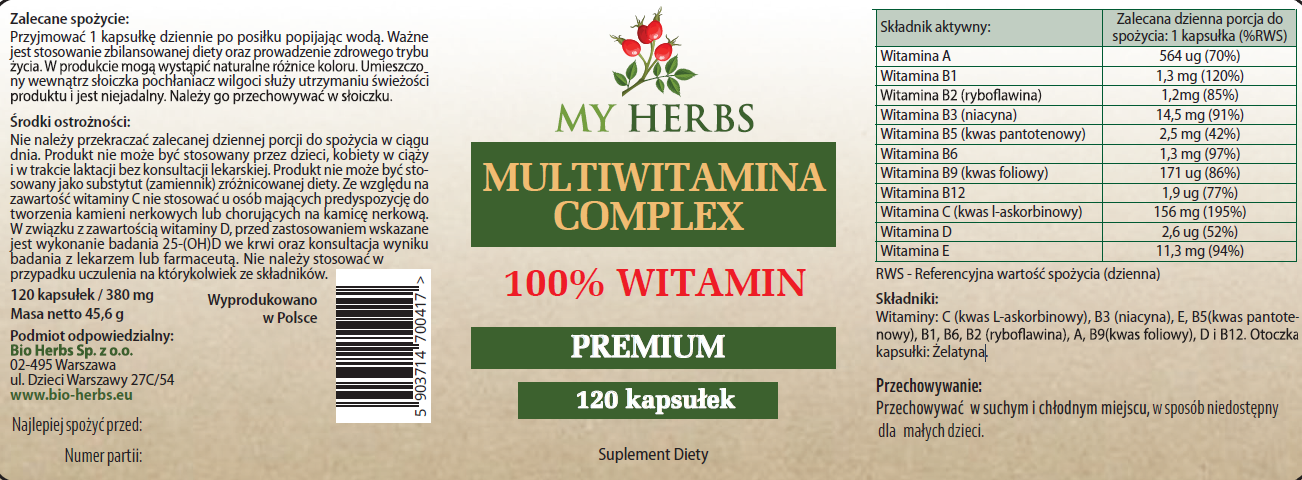 Mutliwitamina Complex to zestaw doskonale dobranych Witamin potrzebnych każdemu organizmowi. Wiemy, że intensywny tryb życia, stres, nerwy, choroby, niewłaściwa dieta czy też używki powodują niedobór witamin w naszym organizmie. Witaminy są niezbędne do właściwego funkcjonowania i budowy organizmu. Niestety nie zawsze jesteśmy w stanie dostarczyć ich odpowiednią ilość w codziennej diecie, dlatego należy wspierać organizm poprzez jej suplementacje. Proponowany zestaw witamin skutecznie pomoże podnieść ich poziom w organizmie przez co będzie on znacznie lepiej funkcjonował.