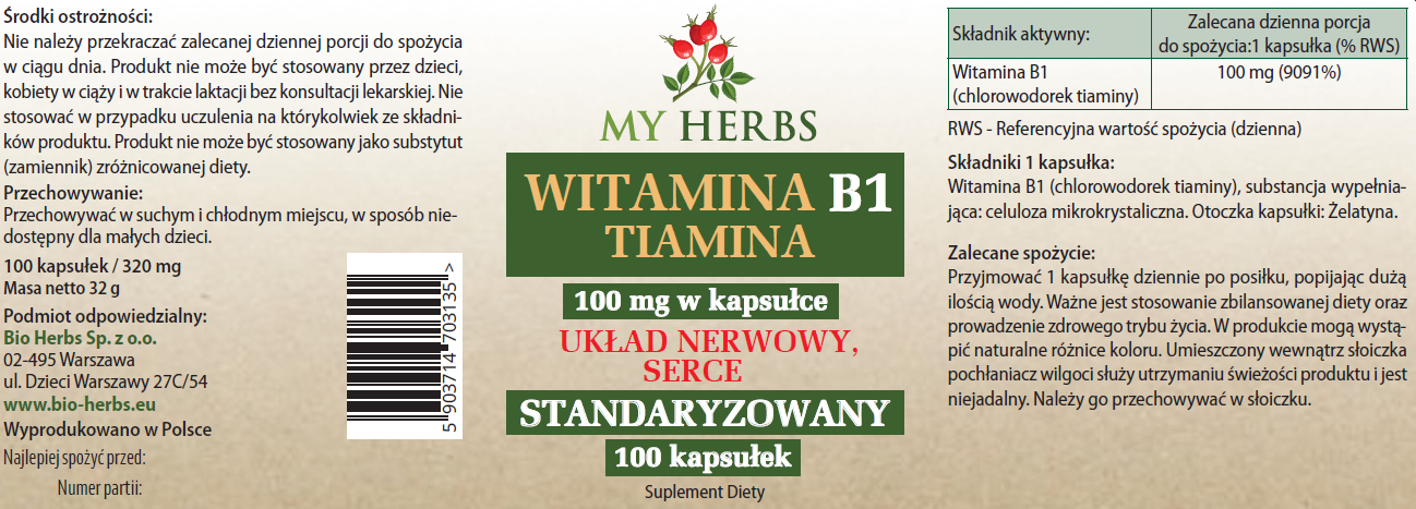 WITAMINA B1 TIAMINA STANDARYZOWANY UKŁAD NERWOWY SERCE 100 KAPS