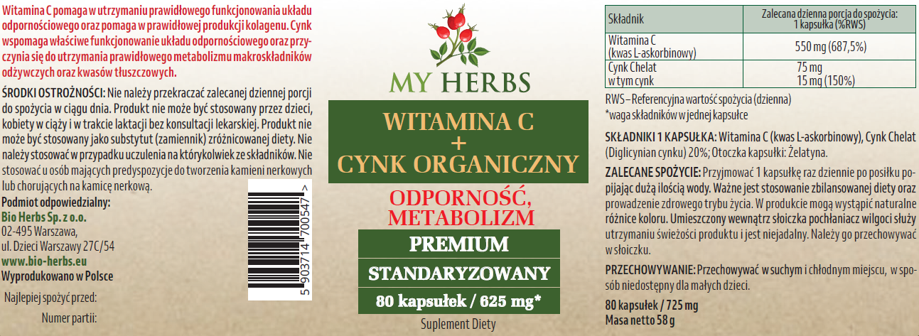 WITAMINA C + CYNK ORGANICZNY 625mg 80 KAPSUŁEK