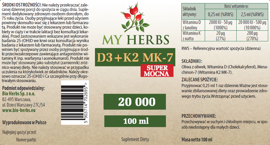 - Odpowiedni dla osób aktywnych fizycznie, dbających o utrzymanie zdrowych kości oraz osób chcących uzupełnić dietę w witaminy D i K.