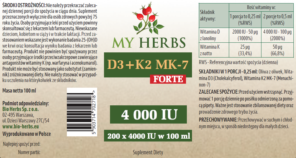 Nie należy przekraczać zalecanej dziennej porcji do spożycia w ciągu dnia. Suplement przeznaczony wyłącznie dla osób zdrowych powyżej 75 roku życia. Osoby przyjmujące leki przed użyciem powinny skonsultować się z lekarzem lub farmaceutą. Niewskazane dzieciom, kobietom w ciąży i w trakcie laktacji. Przed zastosowaniem wskazane jest wykonanie badania 25-(OH)D we krwi oraz konsultacja wyniku badania z lekarzem lub farmaceutą. Produkt nie powinien być spożywany przez osoby przyjmujące środki przeciwzakrzepowe zawierające antagonistów witaminy K (np. warfaryna i acenokumarol). Produkt nie może być stosowany jako substytut (zamiennik) zróżnicowanej diety. Nie należy stosować w przypadku uczulenia na którykolwiek ze składników.