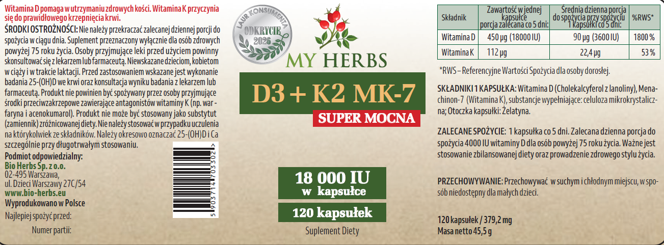 WITAMINA D3+K2 MK-7 SUPER MOCNA 18 000 IU 120 szt SERCE KOŚCI ZĘBY