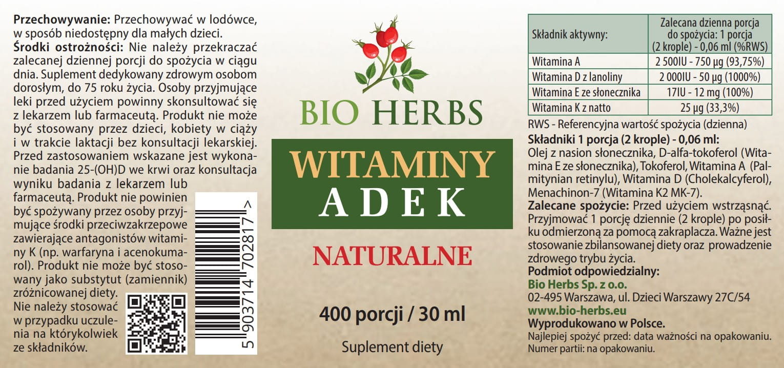 Witaminy ADEK w oleju Naturalne 30ml 400 porcji